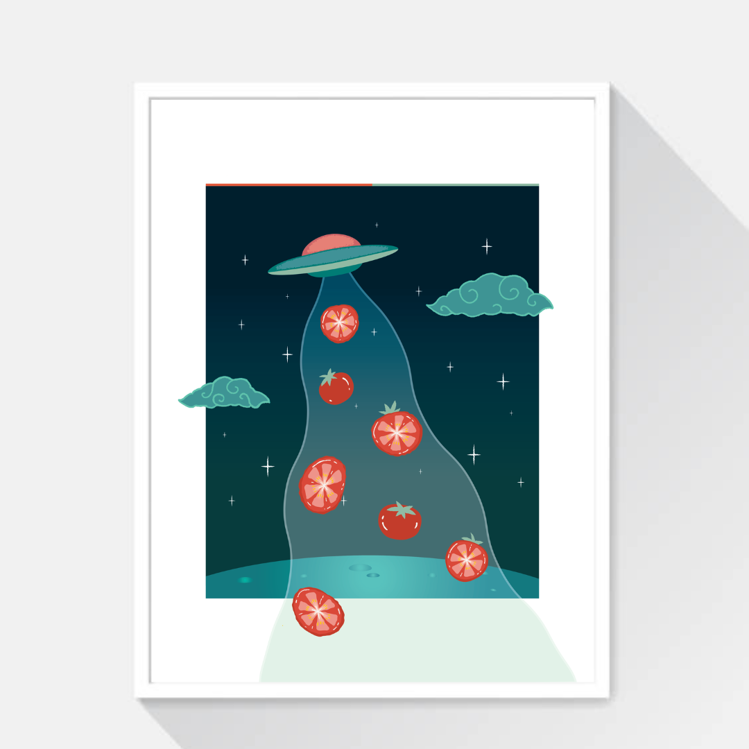 “We Want Tomatoes” from my Daydreams of the Void series. A playful and humorous piece that features a UFO beaming up tomatoes as if they’re the ultimate prize.